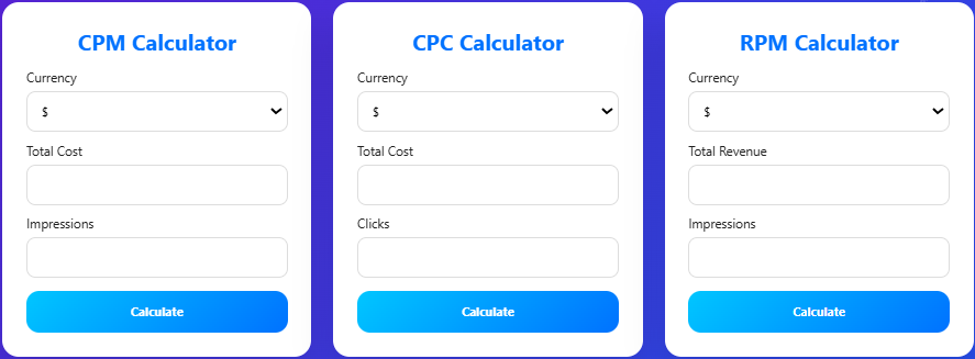 Understanding advertising metrics like CPM, CPC, and RPM is essential for improving ad performance and maximizing revenue. With this all-in-one CPM calculator page, you don’t need multiple tools — everything is available in one place.